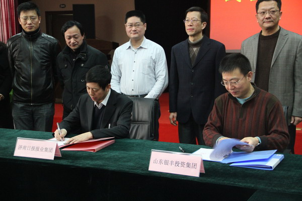 2012年2月9日上午,山東銀豐投資集團與濟南日報報業(yè)集團在銀豐大廈多功能廳正式簽署戰(zhàn)略合作協(xié)議。濟南日報報業(yè)集團董事長孫元文書記、報業(yè)集團下屬六報一網(wǎng)的各主要負責人以及銀豐集團董事長王偉、副總裁劉旭、集團公司各部門負責人共三十余人出席了簽約儀式。