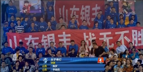為支持山東全運(yùn)乒乓球隊(duì)取得佳績(jī),銀豐集團(tuán)特地組織助威團(tuán)遠(yuǎn)赴鞍山、親臨比賽現(xiàn)場(chǎng)為山東銀豐乒乓球隊(duì)加油鼓勁。比賽現(xiàn)場(chǎng),啦啦隊(duì)高舉橫幅歡呼吶喊,氣氛熱烈,把賽場(chǎng)氛圍推向了高潮。在高昂的加油助威聲中,比賽異常激烈,決勝局在激戰(zhàn)到3平后,李曉霞連得3分拉開(kāi)比分。李曉霞此后越戰(zhàn)越勇,掌控大局以11-6鎖定勝利,就此以4-3險(xiǎn)勝陳夢(mèng),奪得了個(gè)人首枚全運(yùn)會(huì)女單金牌,創(chuàng)造了全滿貫的壯舉。